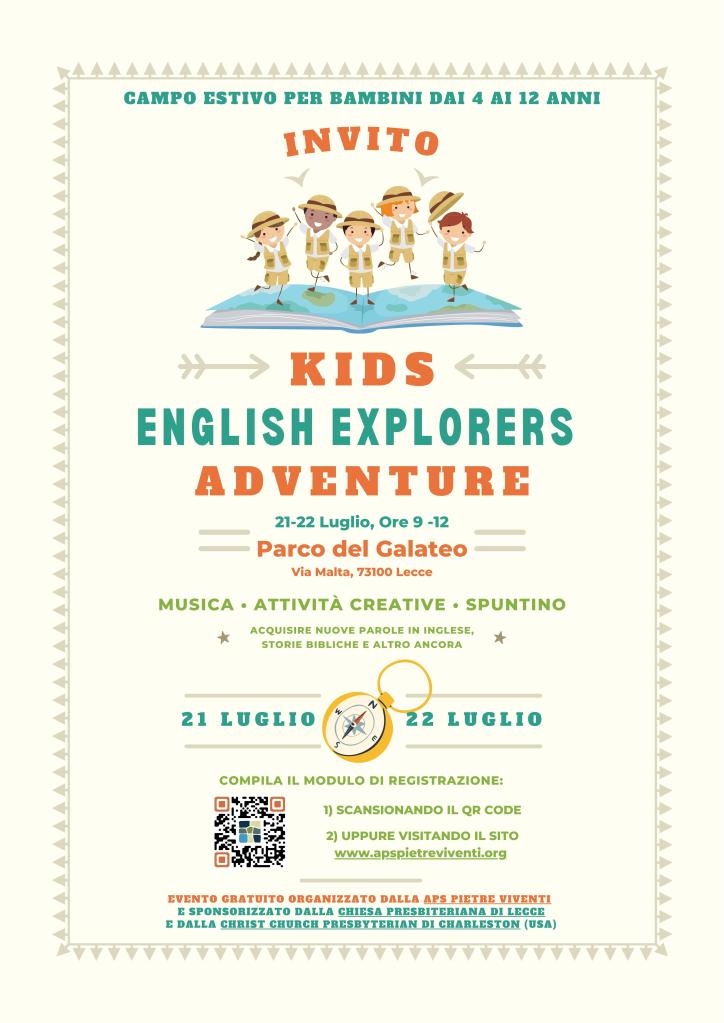 Il Kids English Explorer Adventure Camp è studiato per bambini dai 4 ai 12 anni e si terrà nei giorni del 21 e 22 Luglio 2023 dalle ore 9:00 alle 12:00 presso il Parco del Galateo, Via Malta, 73100 Lecce.