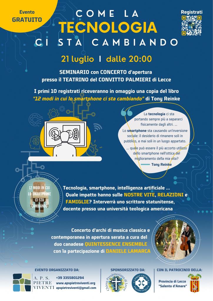Registrati gratutamente al seminario gratuito sull’impatto della tecnologia nelle nostre vite e relazioni che si terrà nella serata del 21 Luglio dalle ore 20:00 nel Teatrino del Convitto Palmieri, Piazzetta di Giosuè Carducci, 73100 Lecce.